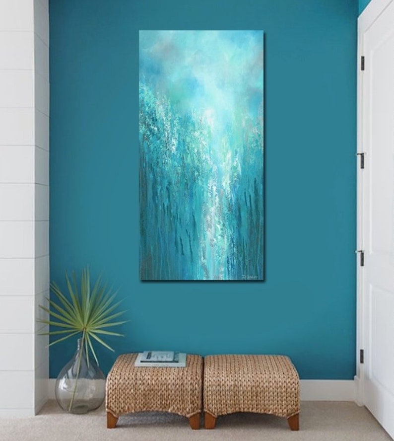 Large Original Wall Art Gray Turquoise Teal Green Blue Tall