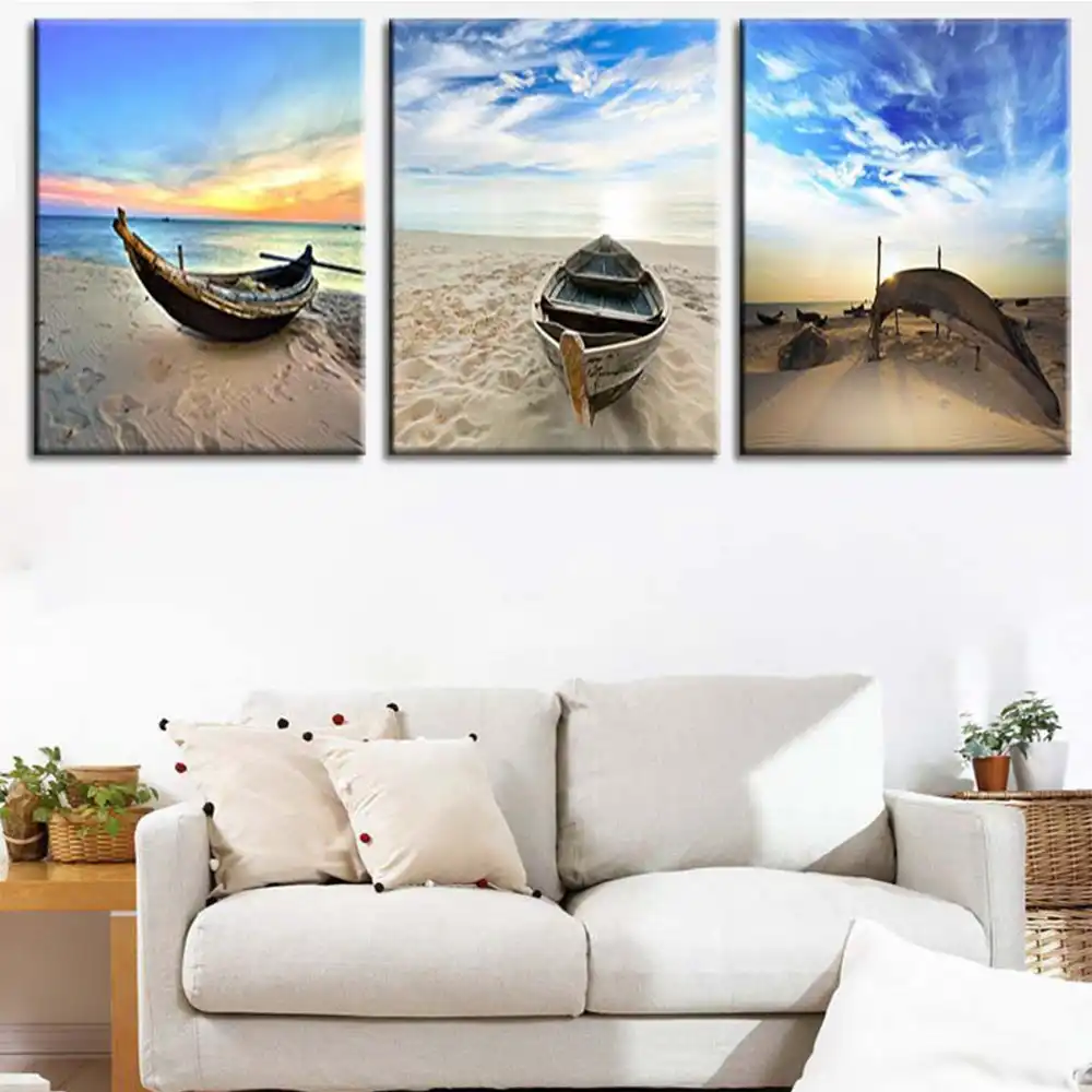 Triple Art Nordic Style Oil Paintings Sea Gull Beach Cabin