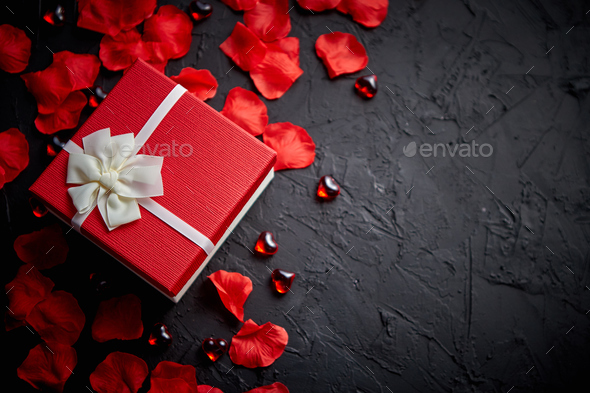 Gift Box On Black Stone Table Romantic Holiday Background With