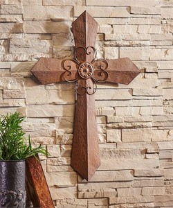 Brown Solid Metal Wall Cross With Wire Flower Center Wall Home