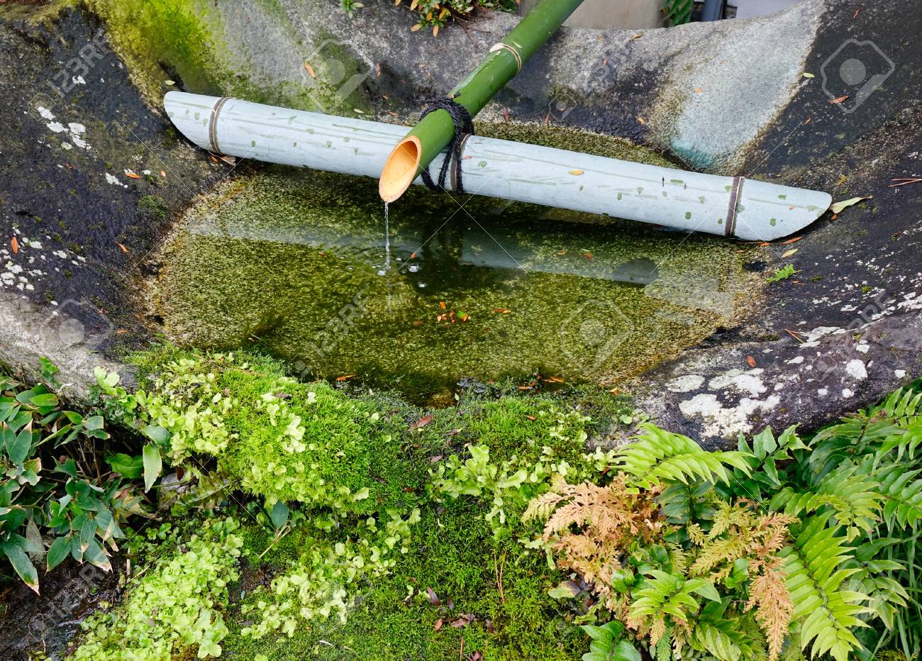 Pagada Stone And Bamboo Fountain In Japanese Garden Stock Photo