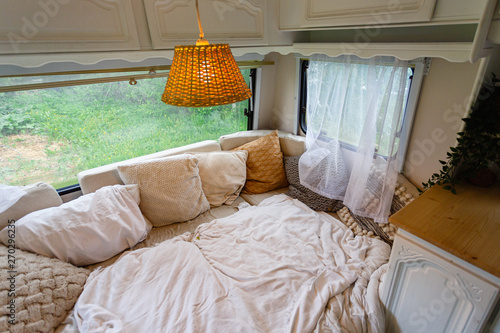 Inside The Camper Van Unmade Bed Pillows White Wooden Interior