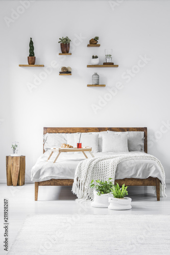 Plants And Decor Placed On Shelves Above Wooden Double Bed With
