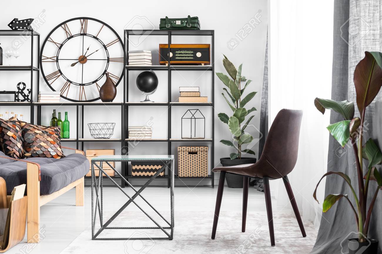 Bright Flat Interior In Industrial Style With Big Clock Potted